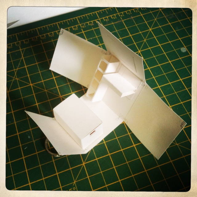 after in depth consideration, flitting back from one to the other, the design above is what will be put into action as I believe once the design is translated into wood their would be too much weight on the front corners when the doors are being opened. therefore the best way to place the roof is behind the seat not in front of the desk. still unsure what will happen to the roof as I suspect the hinges will not bend 360degrees and so then we get into having to have some kind of poles to support the weight of the roof. these could be highly unsightly, and I would prefer them to be hidden inside when the cube is completely folded up. if the cube is completely folded there should be no hint of what is to come inside until it is open. This in turn also excludes having a sunroof option, as the hinges for that would also be visible on the outside. with the hinges I have bought you will only see them once the cube doors open or the roof is lifted. I could possibly have the roof as a entirely separate piece which is lifted on at the end but ideally I would prefer it connected; it’ll all be decided by whether the roof needs its own support.